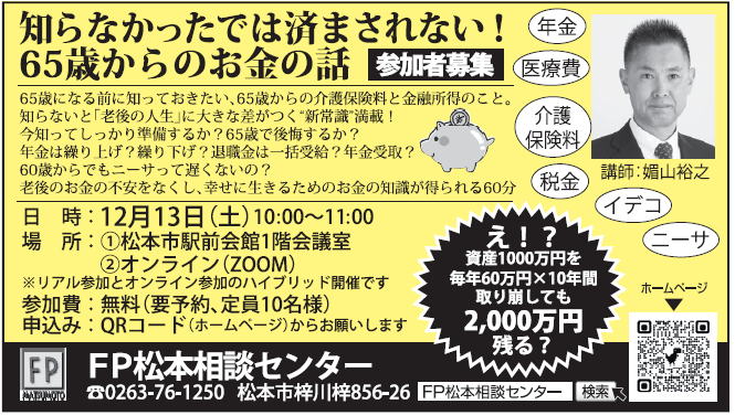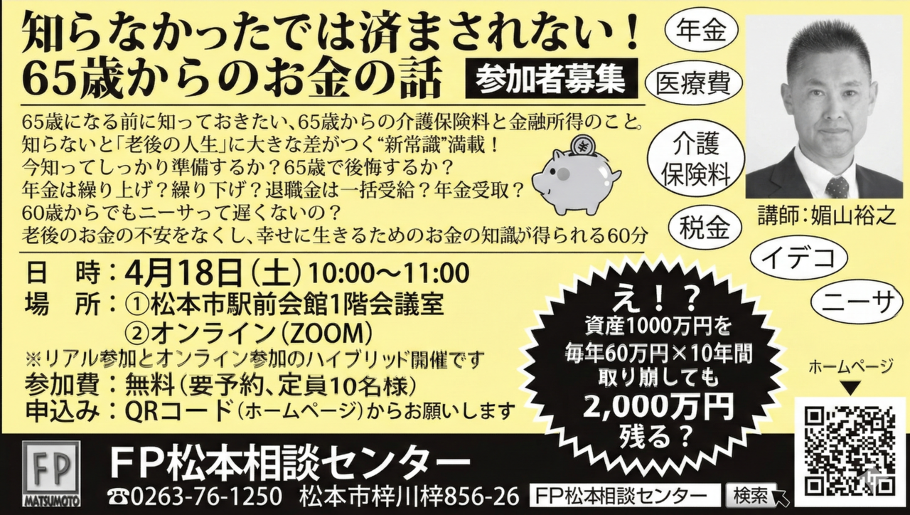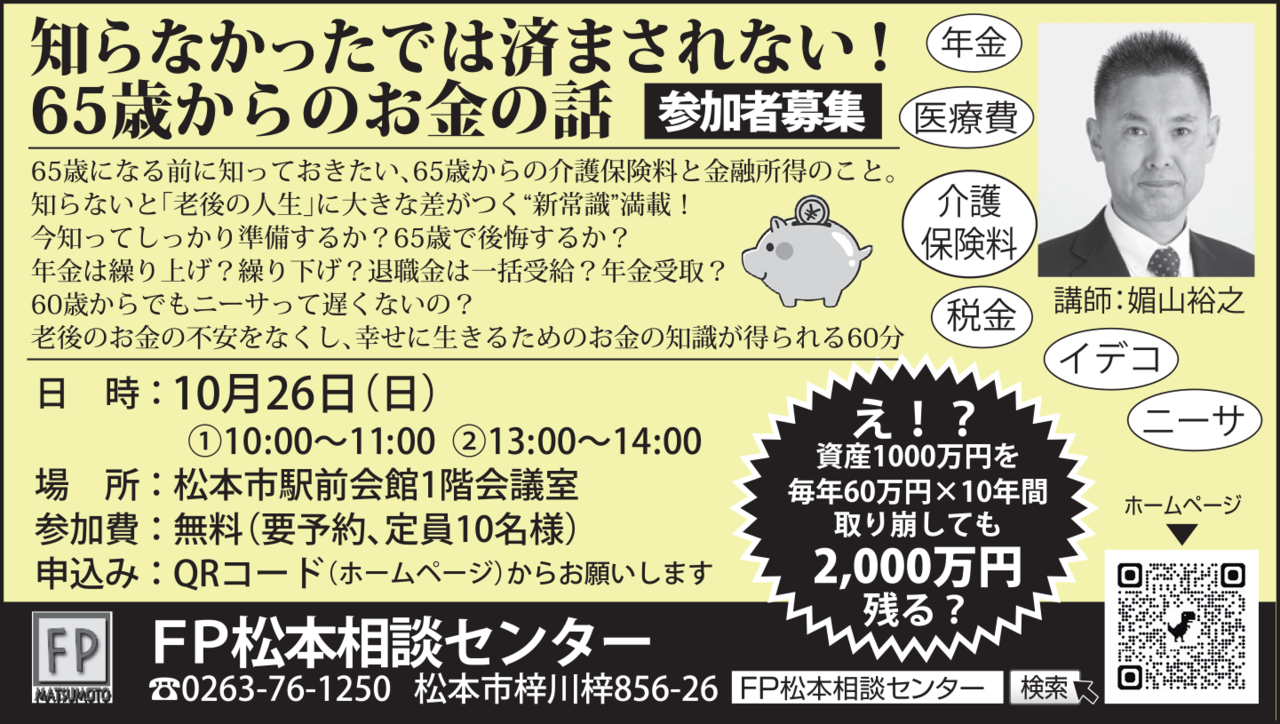 長野県で将来に向けた資産形成をお考えなら、松本市のファイナンシャルプランナー『FP松本相談センター』を、どうぞご利用ください。